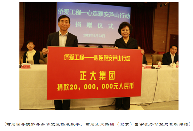 2013年4月20日8時02分,四川省雅安市蘆山縣發(fā)生7.0級地震。消息傳來,舉國震動。中國人民心連心,一方有難八方支援,全國人民與雅安人民站在一起。社會各界紛紛伸出了援助之手,對災(zāi)區(qū)進(jìn)行了各種形式的捐助、支持與幫助。4月23日,正大集團(tuán)為雅安地震災(zāi)區(qū)捐款人民幣2000萬元,集團(tuán)(北京)董事長辦公室楊海浩總裁代表集團(tuán)出席國務(wù)院僑辦舉行的“僑愛工程——心連雅安蘆山”行動捐贈儀式。 正大集團(tuán)是泰籍華人創(chuàng)辦的跨國公司,自一九七九年進(jìn)入中國,在中國的投資遍及除青海、西藏以外的所有省、市、自治區(qū),員工人數(shù)超過8萬人,年銷售額超過500億人民幣,形成了以農(nóng)牧業(yè)、食品業(yè)、商業(yè)零售業(yè)為核心,制藥、機(jī)車、房地產(chǎn)、國際貿(mào)易、金融、傳媒等領(lǐng)域共同發(fā)展的業(yè)務(wù)格局。 正大集團(tuán)董事長、中國僑商投資協(xié)會會長謝國民先生是著名的愛國僑商,對中國懷有特殊感情。長期以來,熱心家鄉(xiāng)教育、公益事業(yè)、醫(yī)療事業(yè)和扶貧救災(zāi),累計捐資超過3億元人民幣。僅2012年全年捐資近2000萬元人民幣。 謝國民集團(tuán)董事長在雅安地震發(fā)生之后,心系災(zāi)區(qū)人民,密切關(guān)注災(zāi)情,第一時間為雅安地震災(zāi)區(qū)捐款2000萬元人民幣。正大集團(tuán)愿與全國人民一道支援災(zāi)區(qū)人民奪取抗震救災(zāi)的全面勝利!